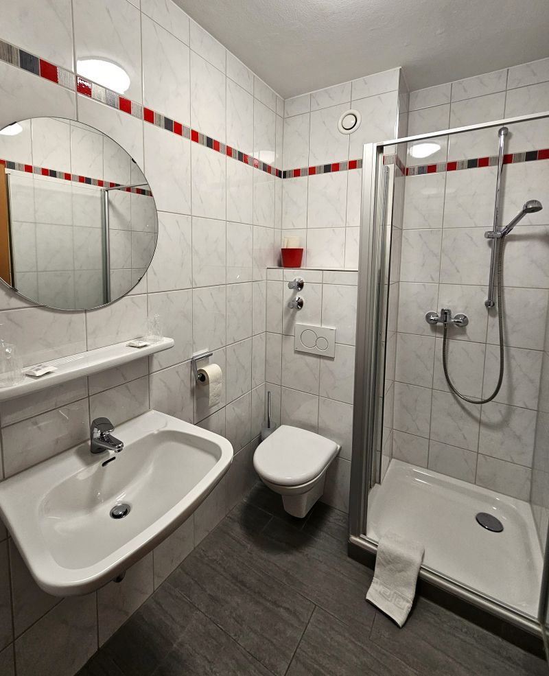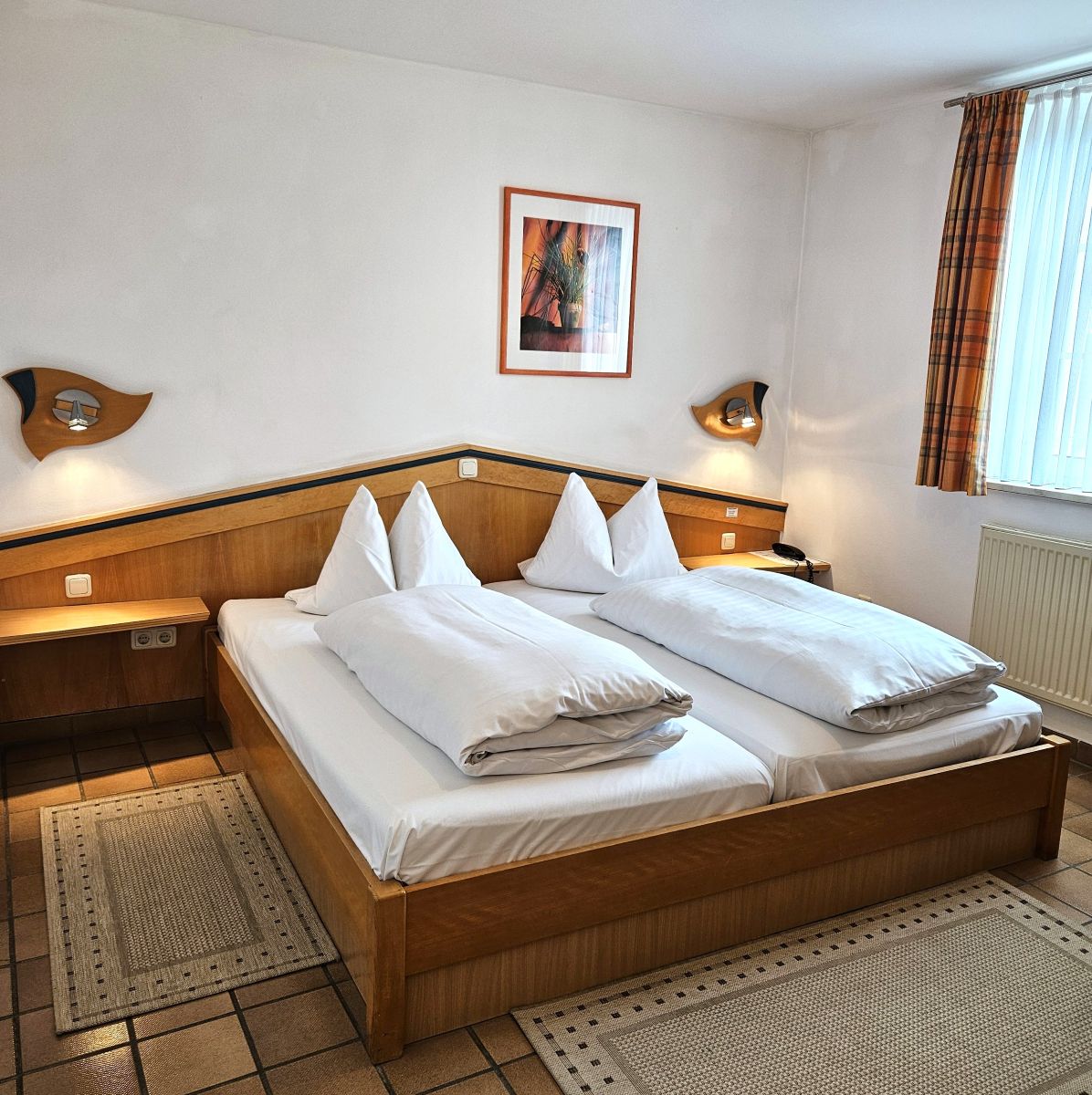 Unsere Doppelzimmer sind freundlich eingerichtet. Zur Ausstattung gehören ein Flatscreen TV, ein Telefon mit Weckeinrichtung, ein kleiner Schreibtisch zum Arbeiten, gratis WLAN und Leselampe am Bett. Die Badezimmer sind mit Dusche, WC, Seife, Hand- und Badetücher ausgestattet.