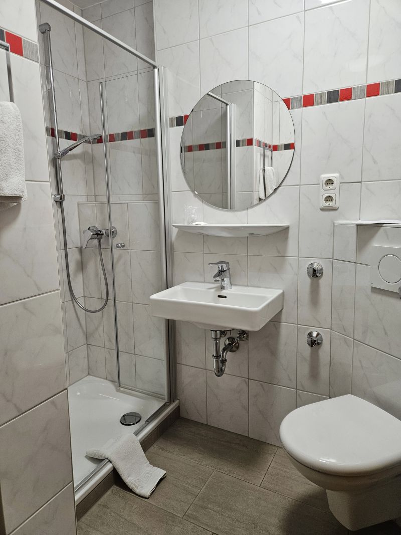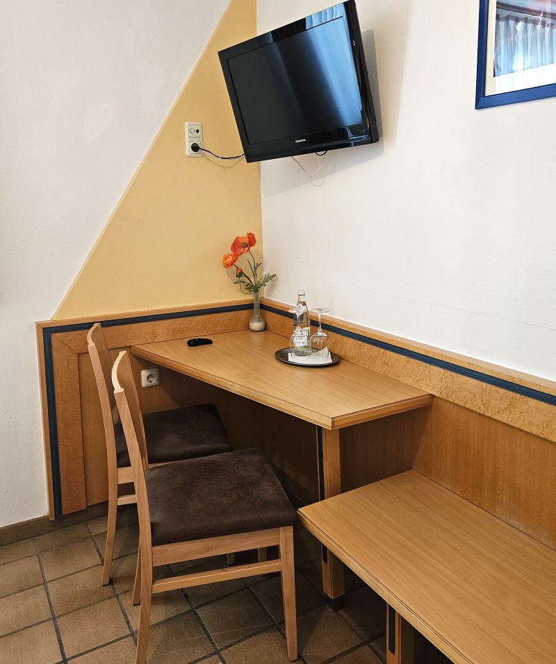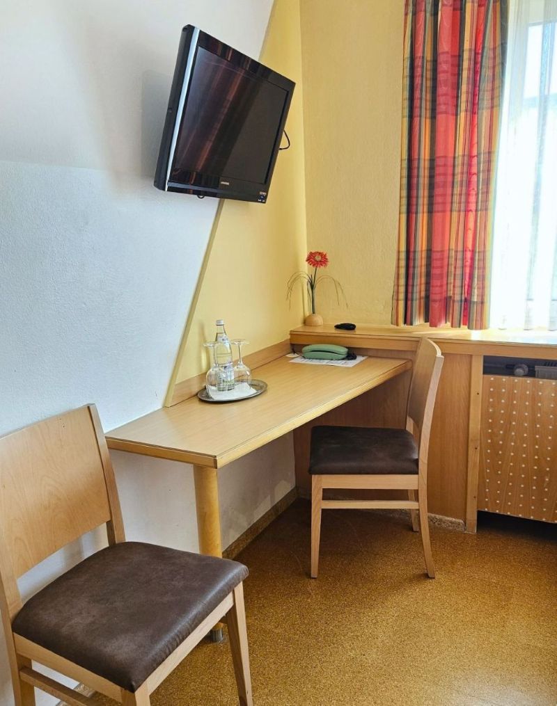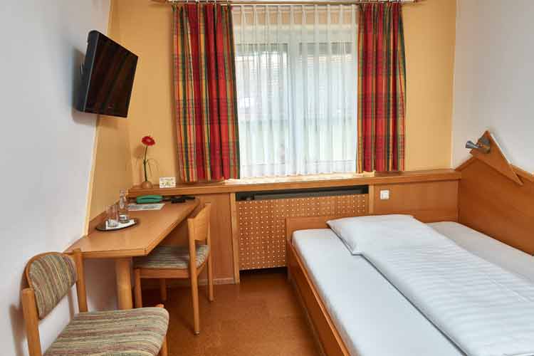 Unsere Einzelzimmer sind freundlich eingerichtet. Zur Ausstattung gehören ein Flatscreen TV, ein Telefon mit Weckeinrichtung, ein kleiner Schreibtisch zum Arbeiten, gratis WLAN und Leselampe am Bett. Die Badezimmer sind mit Dusche, WC, Seife, Hand- und Badetücher ausgestattet.